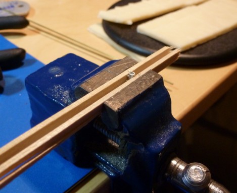 Once you have cleaned up the cut to a nice flat surface, mark the centre with the point of your knife. This is so that your drill bit doesn’t slip. Drill a hole for the brass rod to fit into. Do both the tip and the butt of the pike.