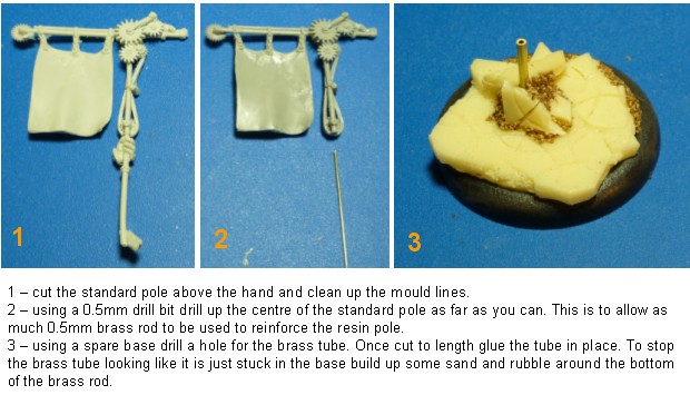 I have made 2 simple flag markers for my Mercenary army so far. A second two are on the cards I just haven’t decided what exactly they will be yet. the first 2 markers used the very steam-punk looking Banelegions standard from the Erec One-Arm model. These are nicely cast resin pieces which are very flexible, for such thin pieces it is definitely better than being brittle. However to help mount them on my armies resin bases I decided to put a thin 0.5mm brass rod pin as far up the standard pole as I could. This will support the resin standard pole while still remaining flexible. The other end of the brass rod was be glued into a brass tube pinned into the base.