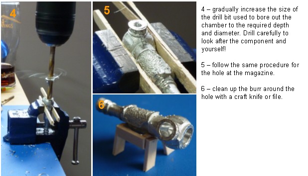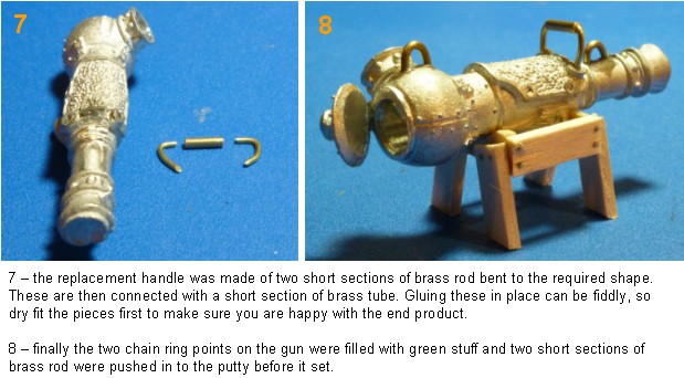 I wanted to take the miscast gun and make it look like it was under repair. The jack’s hand and the muzzle were the miscast sections of the component. The muzzle looks like a bit of battle damage so I decided to leave that, but I clipped off the hand trying to not damage the gun as much as possible, I will replace the handle later. I decided to open the breach of the gun, and also remove the magazine (I assume that is what it is meant to be). I carefully cut these off with a razor saw. At this point I decided to hollow out the rear chamber of the gun, after all I have removed the ‘magazine’ and the gun breach so you would be able to see inside of it. I did this carefully using a cordless drill because the drill bits required are too big for my pin vice. After securing the gun in a modelling vice I drilled a pilot hole in the centre of the gun breach using a 1mm drill bit. I then enlarged this hole with the largest drill bit that fits in my pin vice (2.2mm). Using a 3.5mm drill bit in the cordless drill I slowly enlarged the previous hole. I then finally stepped up the size of the drill bit to match the size of the hole I wanted 6mm. I did this because using the full size drill bit to set off with gave a poor hole finish. I used the cordless drill on the lowest torque setting and went slowly with the drilling, you are not putting shelves up after all. Also you are drilling into metal with a relatively low melting point, and the drilling action generates a lot of heat. I replaced the old handle with one made from two short sections of brass rod bent to shape and a short section of brass tubing. The gun breach door was pinned and glued in place. Finally the holes where the chains attached to Rocinante’s gun were filled with putty and two loops of brass rod pushed into them.