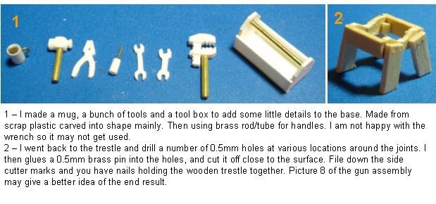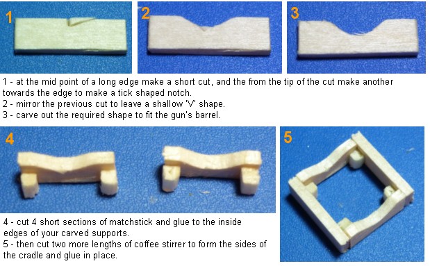 I wanted to build a cradle for the gun to sit on. I wanted it to have a ramshackle, quickly put together look. To build this cradle I used a wooden coffee stirrer. I picked up a couple when I last got a take away coffee. I cut 4 short sections of the coffee stirrer to make the frame of the cradle. Two of the opposite sides had a ‘U’ shaped notch carved into them to support the gun barrel. I then glued them together to make a square. The insides of the corners were supported by short lengths of matchstick. I then used the remains of the coffee stirrer to make some legs. The legs were going to be glued on at an angle, so I cut the bottom of each leg at a slight angle so that they would sit level on the base.