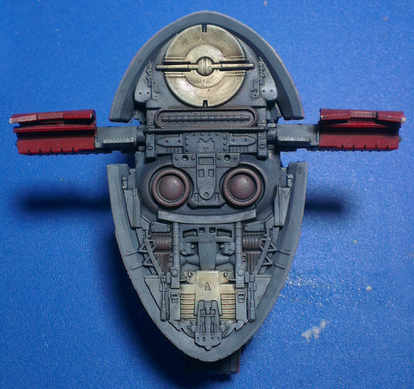 Well the front of the model got an undercoat of brown spray (from the Army Painter range). I left the rear alone for the moment as I was just experimenting. I picked brown because I plan on it becoming visible when I do the weathering and it seems a good colour choice for a battered space craft.