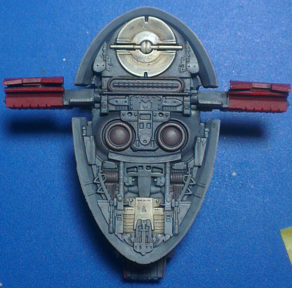 Moving onto the rear of the model now, I mentioned I had undercoated the rear Iron Hull Grey, well back using an airbrush i went round with a various shades of grey (not 50 though) adding highlights to the various surfaces. I also used an ivory colour to