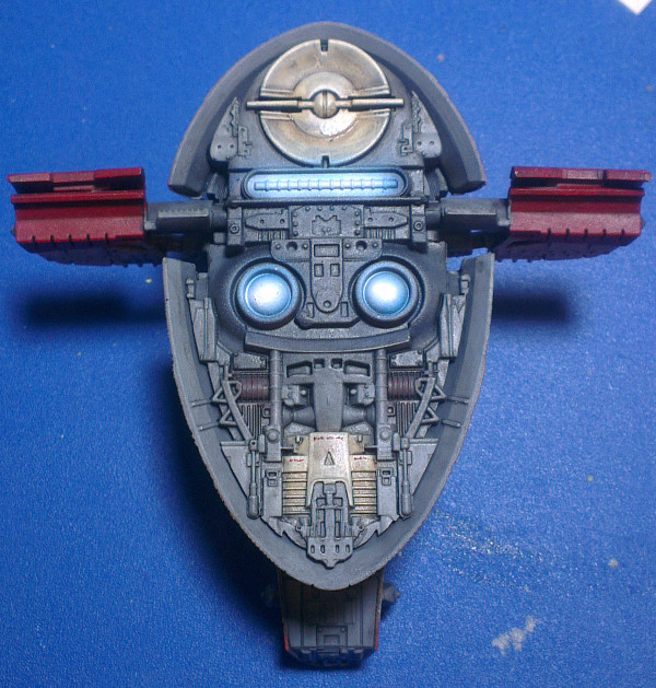 Finally after that I gave the whole front of the ship a black wash. This was to tone down the fairly bright colours I had just used and more importantly to add some shading to the panel lines of the ship.
