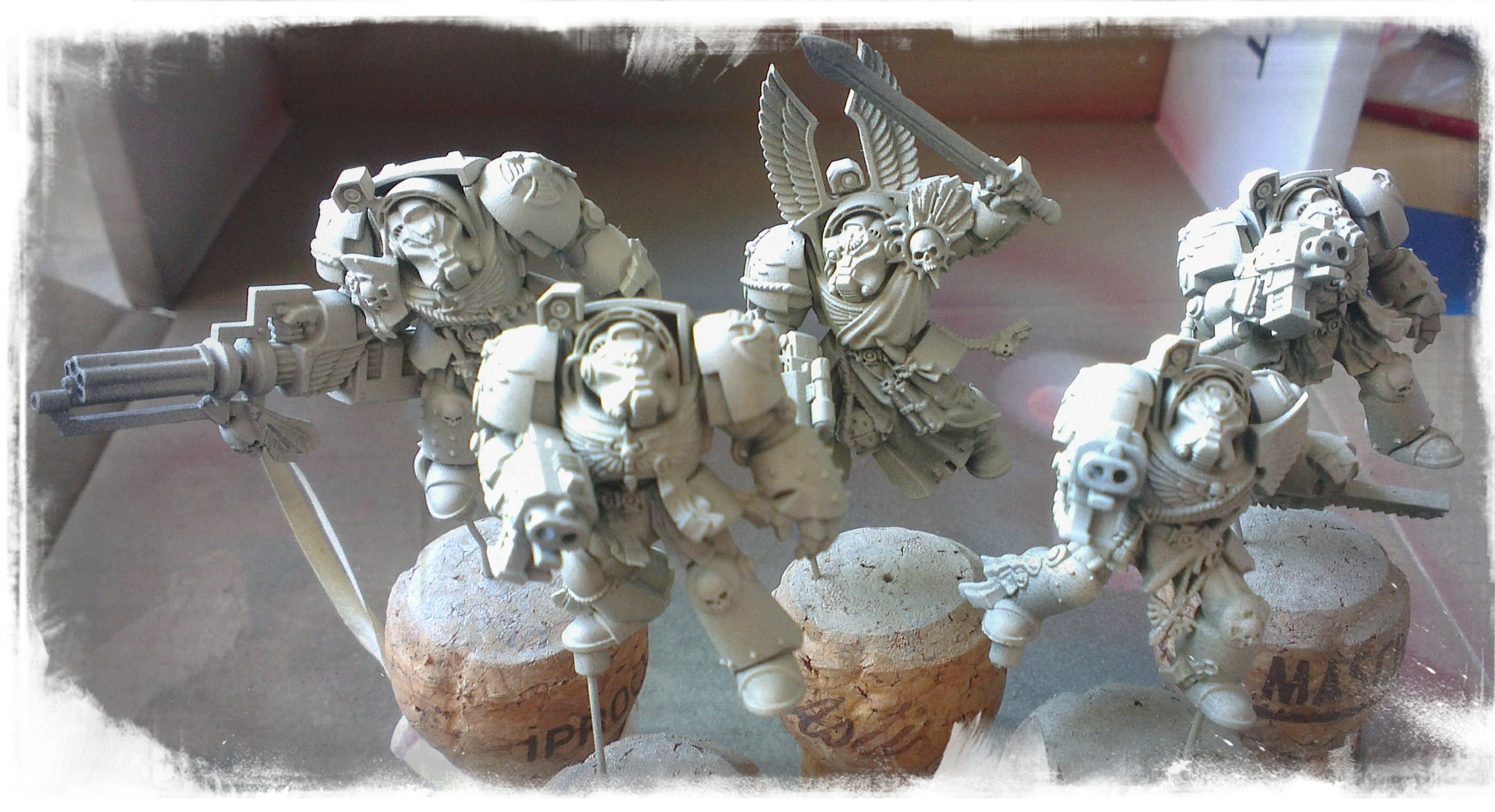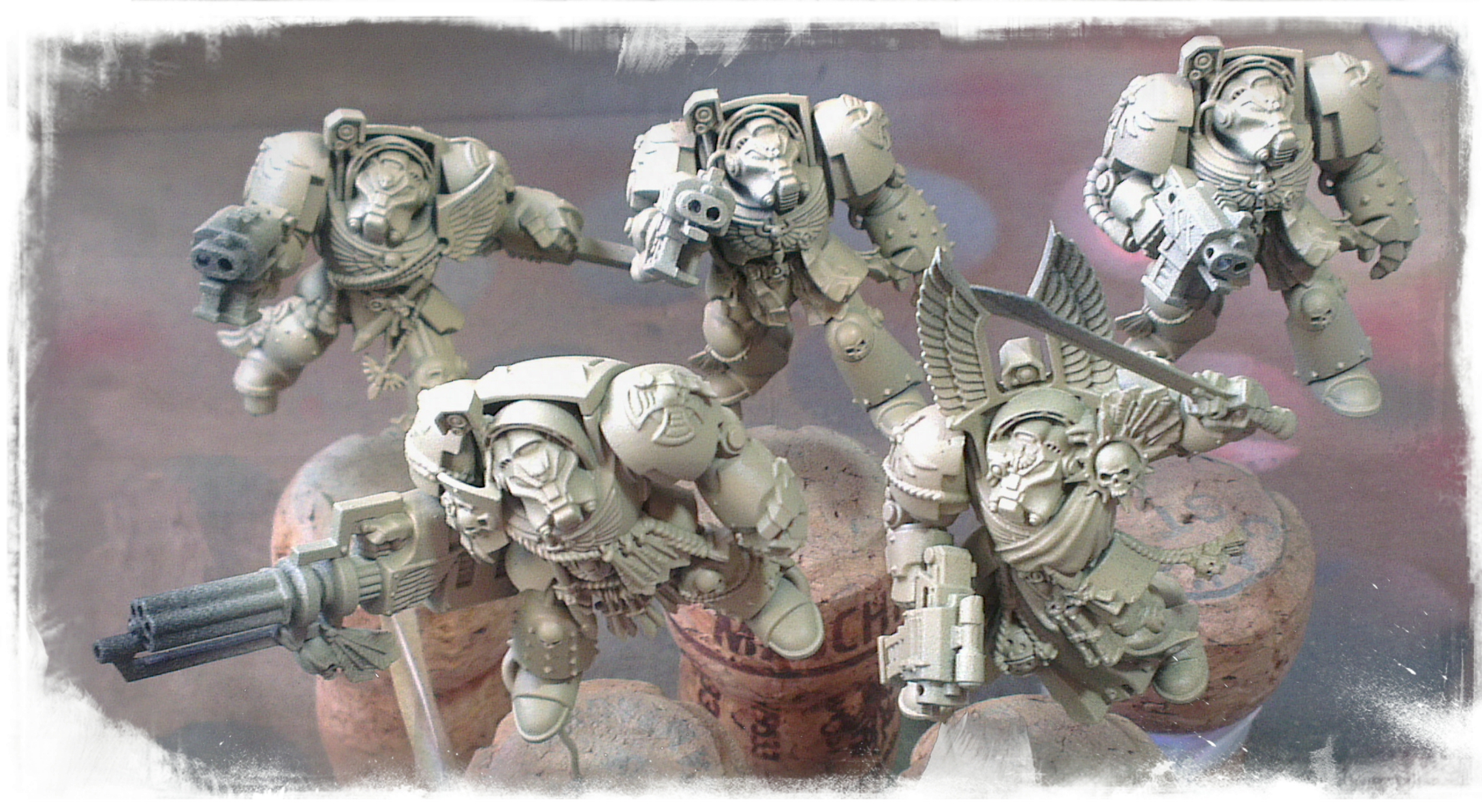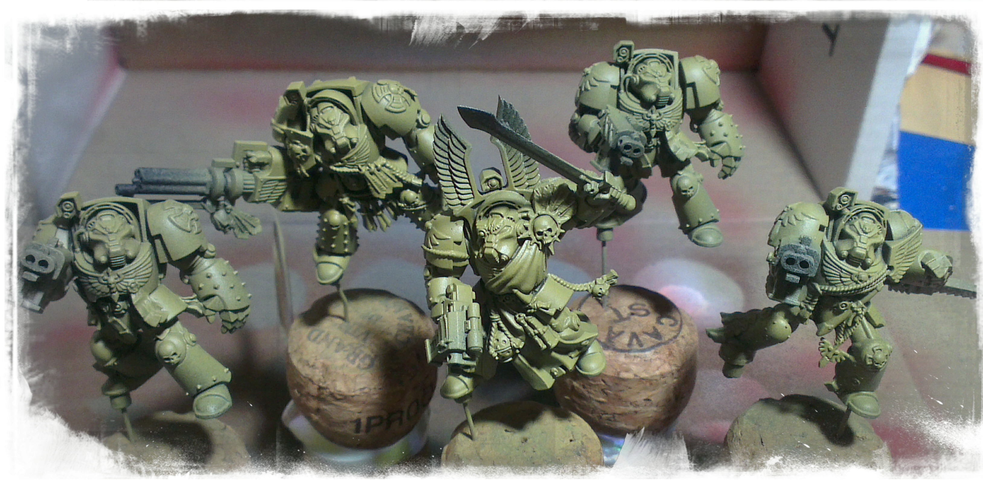 At the end of my last post, after reminiscing about old models, I posted this picture of the Dark Vengeance Terminator models; having been primed with black Vallejo Surface Primer and then basecoated VAC Medium Camo Brown.