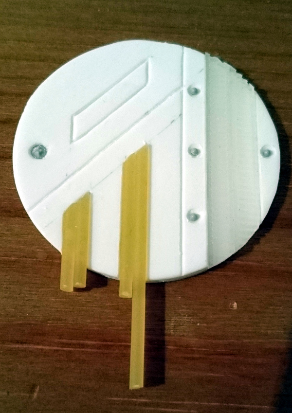You cant see this very well but the right hand circle below has cable ties glued to it and trimmed to match the profile of the disc. Like an idiot I managed to glue these to the wrong side of the disc (the pencil drawn plan is on the other side of the disc).