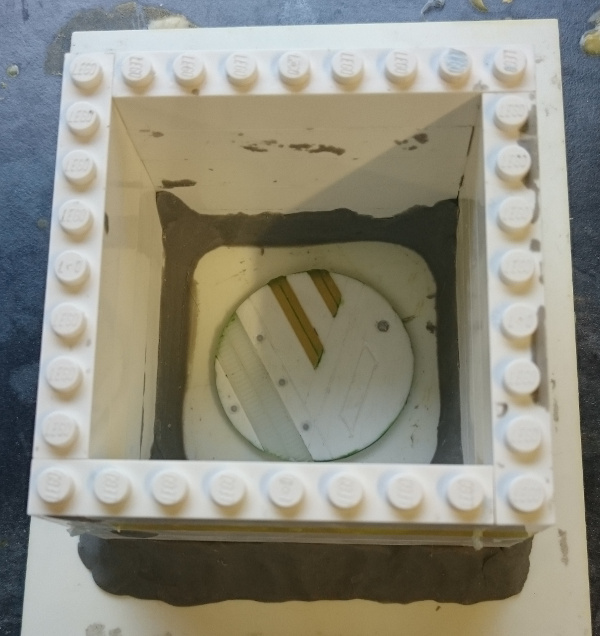 Next I used Lego to make a mould box. I built a square to surround the base with. I then used some more plasticine to hold the Lego in place, and smoothed a thin sausage of plasticine around the inside of the Lego square to seal the sides of the mould box to hold the silicone. It is easier to seal the inside of the mould box while it only has low sides, so to complete the mould box I built up the Lego walls.
