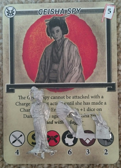 Then there are two sets of warrior cards, the cards that allow you to build your force and play with them during the game. One set for the blue team, and one set for the red team – the box is set up as a two player starter set. The Geisha was a pre-order model, which was supposed to be an unarmoured Samurai, but due to a mix up i have got the Geisha and not the Samurai.