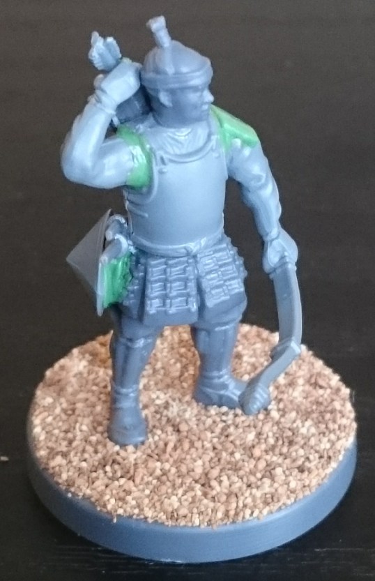 The left arm holding the bow was adjusted at the shoulder joint. Some plastic was shaved off the arm at location of the arm pit to allow the arm to be placed in a lowered position. Greenstuff was used to fill the remaining gap, at this location I added some shoulder armour because I hadn’t taken any material off the top of the arm. This made it difficult to get a nice smooth flow to the sculpting representing the clothed shoulder. The shoulder armour hides this quite well.