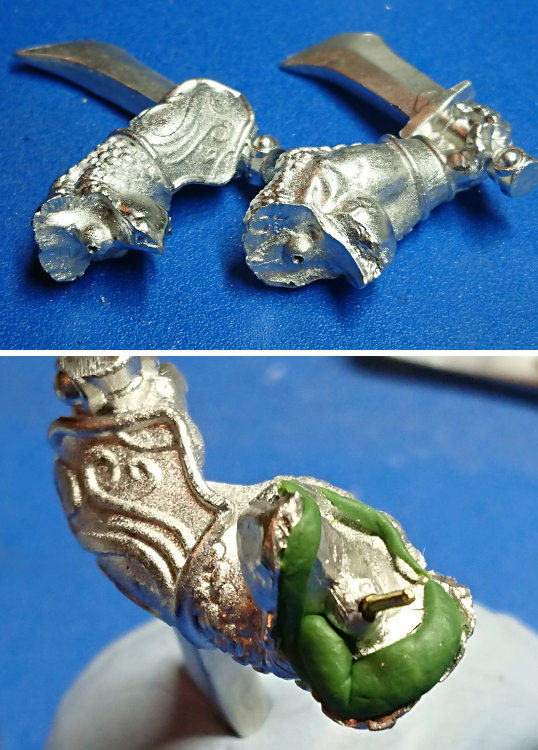 Glue was added to the joint’s pin, and some of the surrounding metal and greenstuff – bear in mind you do not want superglue squeezing out of the joint with the greenstuff. That gets real messy quickly! So go easy with the glue. Then I repeat how I fitted the parts together while i was dry fitting them. You can control where the greenstuff gets squeezed out a little by how you bend and push the arm into place.