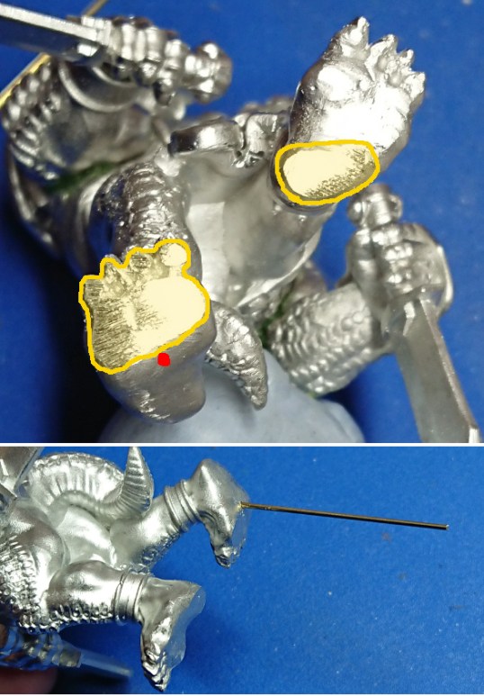 With Ræth now assembled I turned to his base. When I stood him on his feet it was obvious that they weren’t flat enough on the bottom to have a hope of standing him unsupported. I did intend to pin him to his base, and also use some greenstuff to secure him too. I also thought it would be a good idea to try to flatten some of the underside of his feet to get the attitude I wanted for his positioning. In the image below I have highlighted in yellow the areas where I used a file to level off the soles of his feet. The red dot is where I drilled a 0.8mm diameter hole to place the supporting pin – I did not glue this in place at this time.