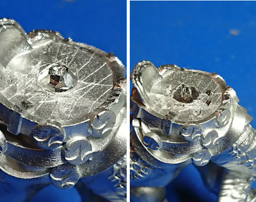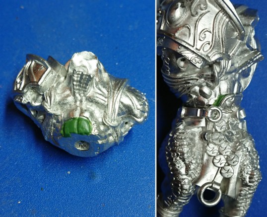 When position the torso on to the legs there is a large gap between the parts. I thought I would try what I did to Golem (link) and see if that closed the gap. I filed the top of the domed locating key flat, I also drilled a 0.8mm diameter hole into the centre to use for pinning later on. This didn’t close the gap, like it had done for Golem. I then started to shave the edges of the dome off to try to get the key to fit in the recess on the torso and hopefully close the gap. I seemed to be removing a lot of material and not achieve much gap closure. I got fed up of this so I cut away the locating key completely to leave a flat surface with my previously centre drilled hole in it.