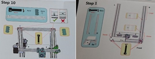 Backtracking through the instructions Step 10 fitted the cross bar to the top of the uprights. I almost loosened off these bolts a little, however my guilty conscience started nagging at me, because… Way back at Step 1, I really graunched up the bolts attaching the uprights in the first place. I turned the printer on its side and loosened those bolts off – there was no need to apply as much torque as I had done in the first place – and tightened them to a more reasonable level. Putting the printer back on its feet I found that all 4 were back touching the table.