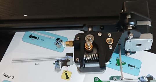 Don’t worry this isn’t a step by step how to build the Ender-3, I’ll just highlight some issues I had with the build. My first issue was with Step 7, and how the two screws mounted the Bowden extruder bracket to the V-slot bar. In my defence I was still being “helped” by my 4 year old, but at the time I was struggling to orientate the bracket as per the diagram and work out how to attach it. The eureka moment, pictured below, when I realised the holes on both plates that form the bracket line up allowing the long shaft of the allen key to tighten the bolts.