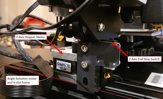 The time has now come to switch it on. At this point I realise there are no instructions in front of me on how to actually use the printer. The inner 4 year old says “you don’t need instructions, its only got a single push button twiddly knob” (they were on the supplied micro SD card). So I power it up, and scroll through the menu system. I find the ‘Auto Home’ selection and press the knob. The x-axis motor whirrs to life whizzing the nozzle assembly into the x-axis end stop switch, turning off the motor. Then the y-axis does the same. The z-axis motor powers up, turning the threaded bar bringing the x-axis bar down towards the end stop switch. Just as it touches the switch the bar stops moving and there is an horrendous noise as the motor continues to try and turn the threaded bar. I quickly switch off the power, and start taking a closer look at the z-axis mechanism.