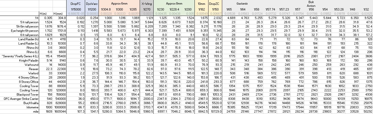 I have been thinking about scale recently, mostly because of the upcoming release of Adeptus Titanicus and reading some discussions about how big the titans ‘should’ be lol. However it is also because I want to build up some terrain, add some interesting items to bases, that kind of thing – and not just for Titanicus, but across all my game systems. So I played about with a spreadsheet to work out the dimensions of various items at various scales. I’ve actually had this spreadsheet for a couple of months now, but never got round to typing this up. I figured somebody out there might find it useful too, so is here my blog post about model scale.
