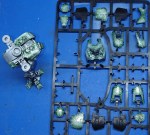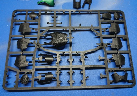 Applying the paint with sponge to the paints on the sprue was very easy if they were relatively flat. However the highly curved parts were a little more problematic so I removed the carapace and chest plate from the sprue. The armour plates already on the model were easy to do, although during the later steps I found it hard to target the exact areas I wanted of the smaller pieces, the leg pistons’ armour, and toes.