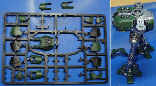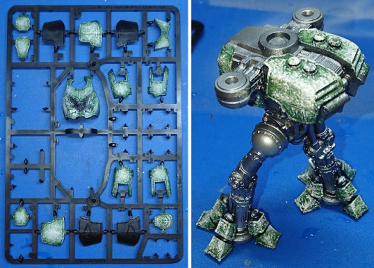 The Reaver had been assembled, but most of the armour plates were left on the sprue. This sprue was sprayed with AP Black undercoat. I didn’t choose black for any particular reason, I didn’t really give it much thought. The Reaver was mostly assembled, and had been painted silver, but I’d left nearly all the armour on the sprue.
