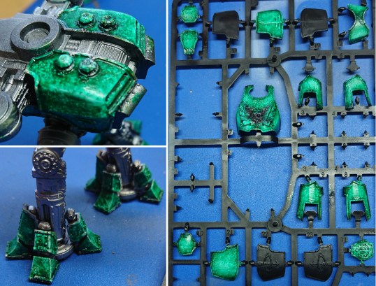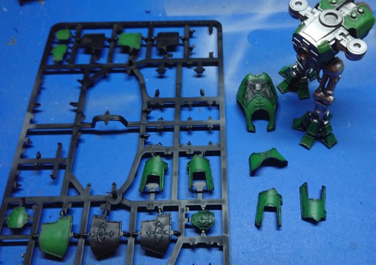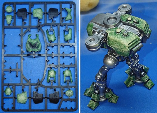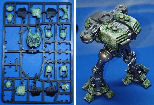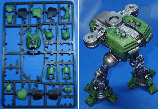 My original intention was to paint up my titans as Warp Runners, but they seem pretty common looking around the net. So I thought I’d try something different: Imperial Hunters (although I suspect with a recent book release they’ll get more common). Before writing this article I’d just done one panel of the Reaver as a test for the mottled green armour. The article was written up on the armour plates I was intending to use on my Reaver.