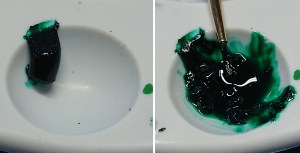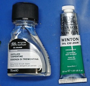 The oil paint is a thick paste, it needs thinning down with turps to use. The oil paint on the left straight from the tube. On the right being mixed with some turps into a thin usable wash.