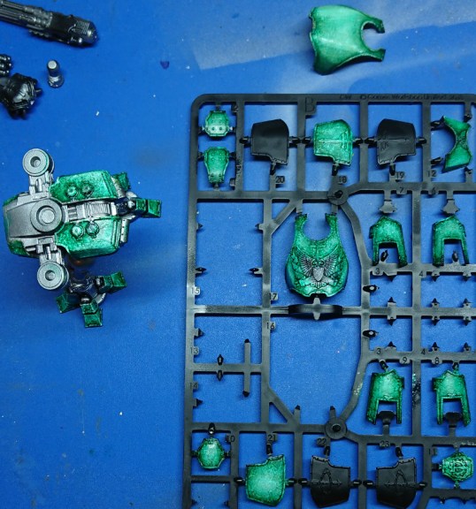 The best part is, if like me you don’t get long sustained periods of hobby time, you can leave the oil paint and pick it up later. All you do is reactivate the paint with the solvent. In fact after completing the work above I came back next day and realised that I had not got the model as pale as my original test piece. So I got the turps out again and worked the armour some more to get it lighter. In the image below I have left the first carapace above the sprue to hopefully show that I’ve reworked the oil paint to get the same hue of green as it.