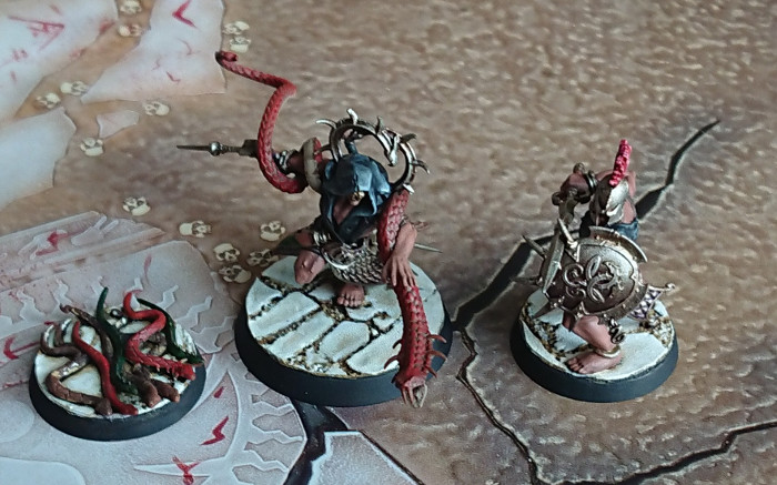 There was no real logic applied, other than a little common sense, in how I divided my warband up into the three groups. I wanted a hard hitter in each group, I wanted to try and make each group as survivable as each other, basically just balancing each group as well as possible. It made sense to keep the snakes and the snakechamrer in the same group as they interact with one another. My Splintered Fang warband was split up as follows.