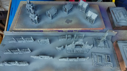 The assembly work had already been completed by Bryan the owner of Rogue Games, so the first step for me was to get the scenery primed. To this end it was all rattle can sprayed black. This was then followed by two coats of grey primer. The first grey coat was at an angle from the sides, the second coat was from above. This was essentially a zenithal undercoat but without using white, ensuring that the upmost surfaces were a solid grey and the deepest shadows remained black. Hopefully having a nice transition between the two, you need to be careful when using rattle cans to do this type of work, as there isn’t that much control with a spray can.