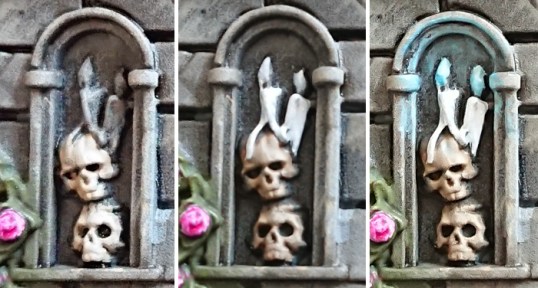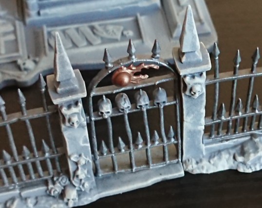 With the stone dry brushed it was time to paint the railings. A little care was taken to avoid getting the metallic paint on the stonework. The railings, gates, and spikes on top of the walls and roofs were paint dark silver – VMA Metallic Black 71073. The statue, the top of the spire, and the cross on top of the stone archway were painted VMA Metallic Rust 71069.