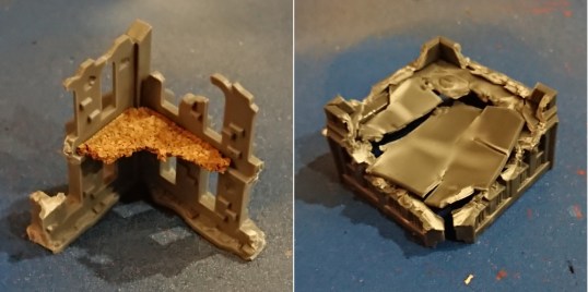 I pre-orderd the Titan and before it even arrived I started building the base. I want the Psi Titan to be stalking through a ruined city-scape. I got out one of the Titanicus Civitas Building sprues and my old Epic Armageddon buildings to see if i could create some ruins on my Titan’s base. I also got various other building materials, plasticard sheet/strip, cork, sandpaper, etc.