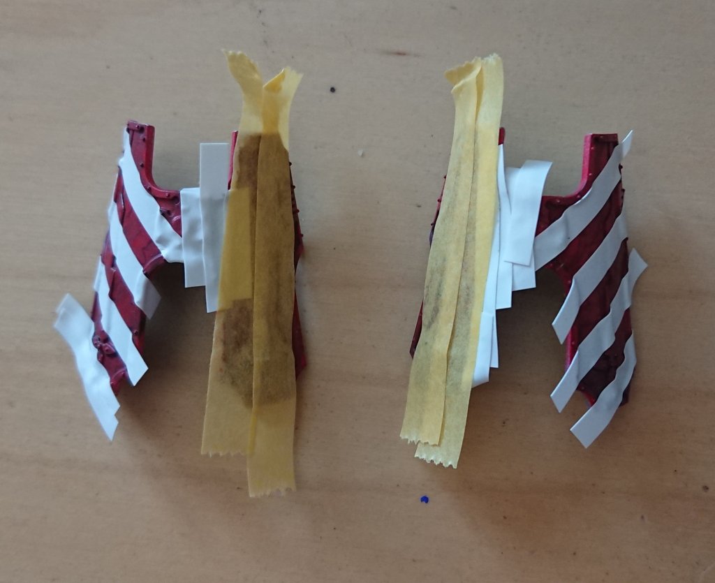 Paint is going to bleed under the edges of the tape slightly, I tried to minimise the damage by airbrushing some of the base red colour I used for the plates – perhaps a better idea would be some clear varnish. In fact it’s probably a good idea to varnish before masking, just incase the paint underneath is delicate and lifts with the masking tape at the end – that would be a disaster!