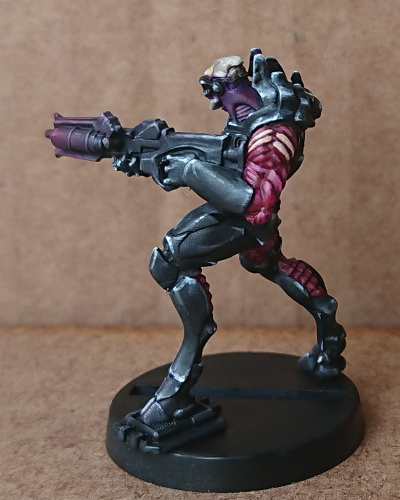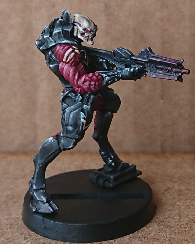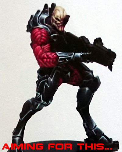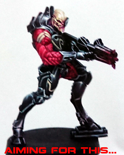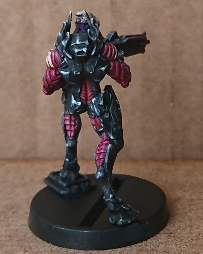 After a few more steps, adding some colour to the gun, and some detailing/freehand to the armour, I reached the end of the painting guide. There are 18 steps in total, and I really enjoyed the process, more so than I have enjoyed painting a mini for a while actually. I think this is because there is no indecisiveness on my part over what colour to paint this tiny little detail here, or that armour plate over there. There are no massive dilemmas of should I use ‘this’ red tone or ‘that’ red tone on this location.