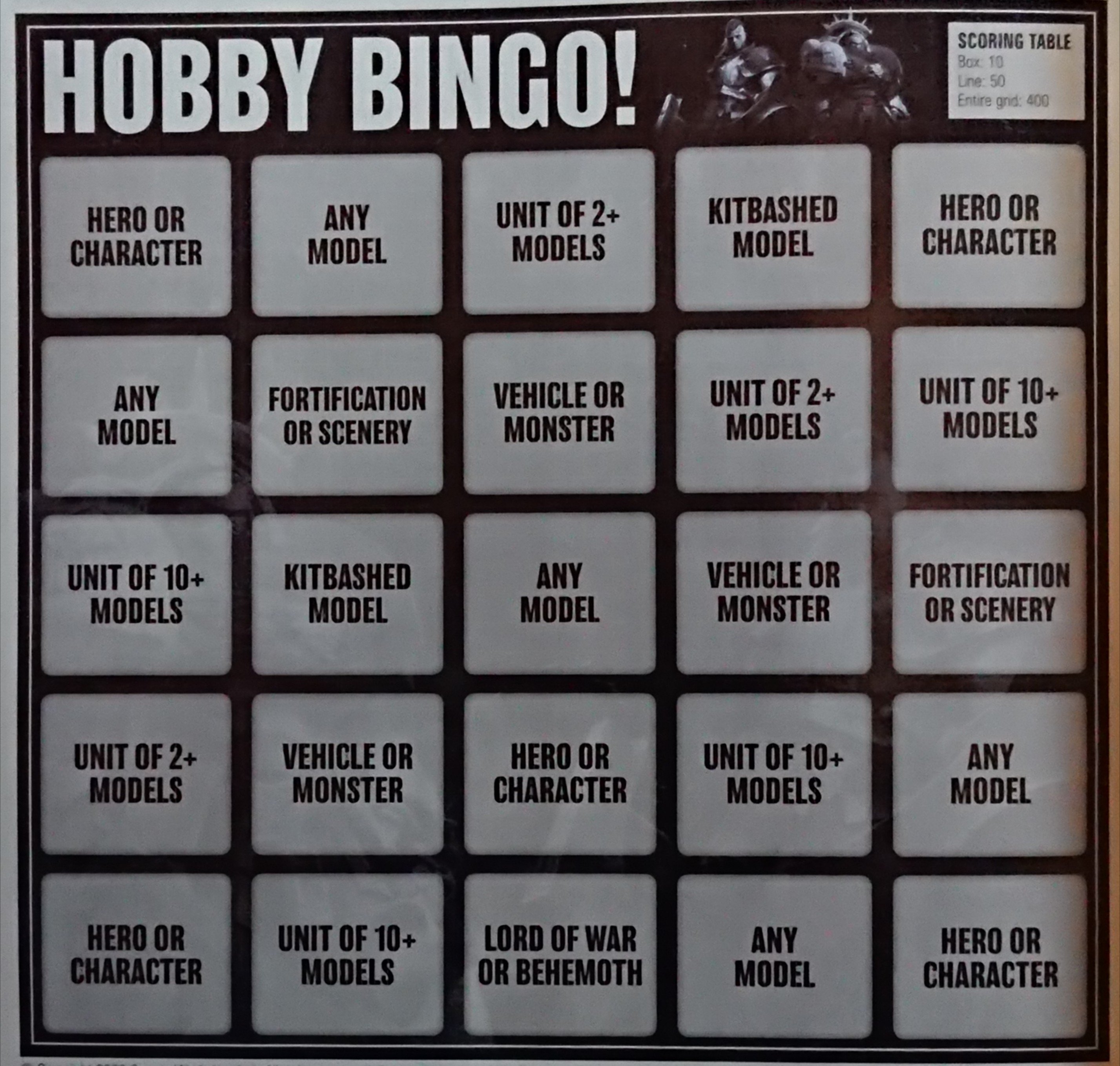 I saw an idea I liked in the back pages of a White Dwarf mag recently; basically hobby bingo. There’s a grid of hobby objectives to complete, and you tick off a box when you’ve achieved that hobby objective. This blog is not solely a GW orientated blog, and so a little adaption will be required for my uses. But its a sound idea, and I quite like to see where it takes me over the course of a year.