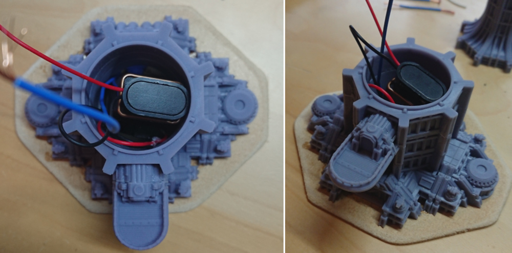 Again, there was another round of dry fitting circuitry into the tower build before any real assembly took place. Then it was time to start piecing the parts together. Before the ground floor could be assembled I need to mount the LED in place. I did this with a blob of greenstuff, and soldered the LED circuit in as well.