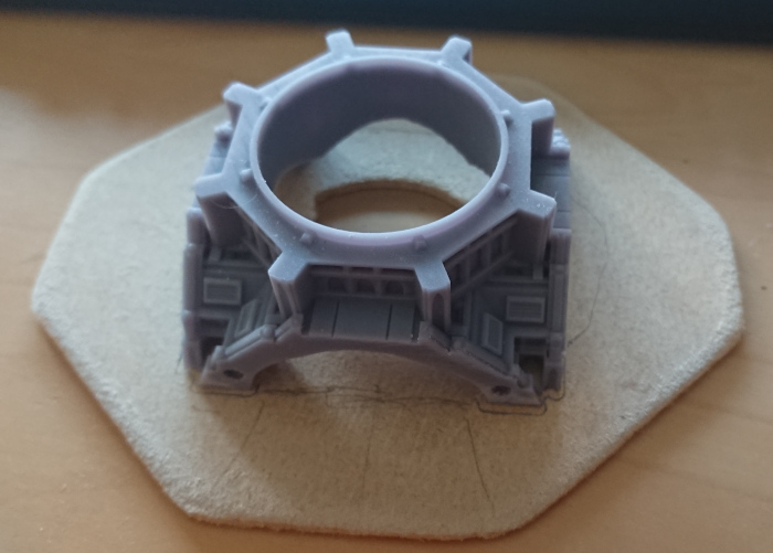 Before I could really start building, I needed a base to stand it on. This was simply a piece of hardboard, that I’d cut a little larger than the resin parts making up the ground floor. I then sanded the edges smooth, and rounded them off. I cut a hole in the centre to allow access to the switch and battery from underneath the tower.