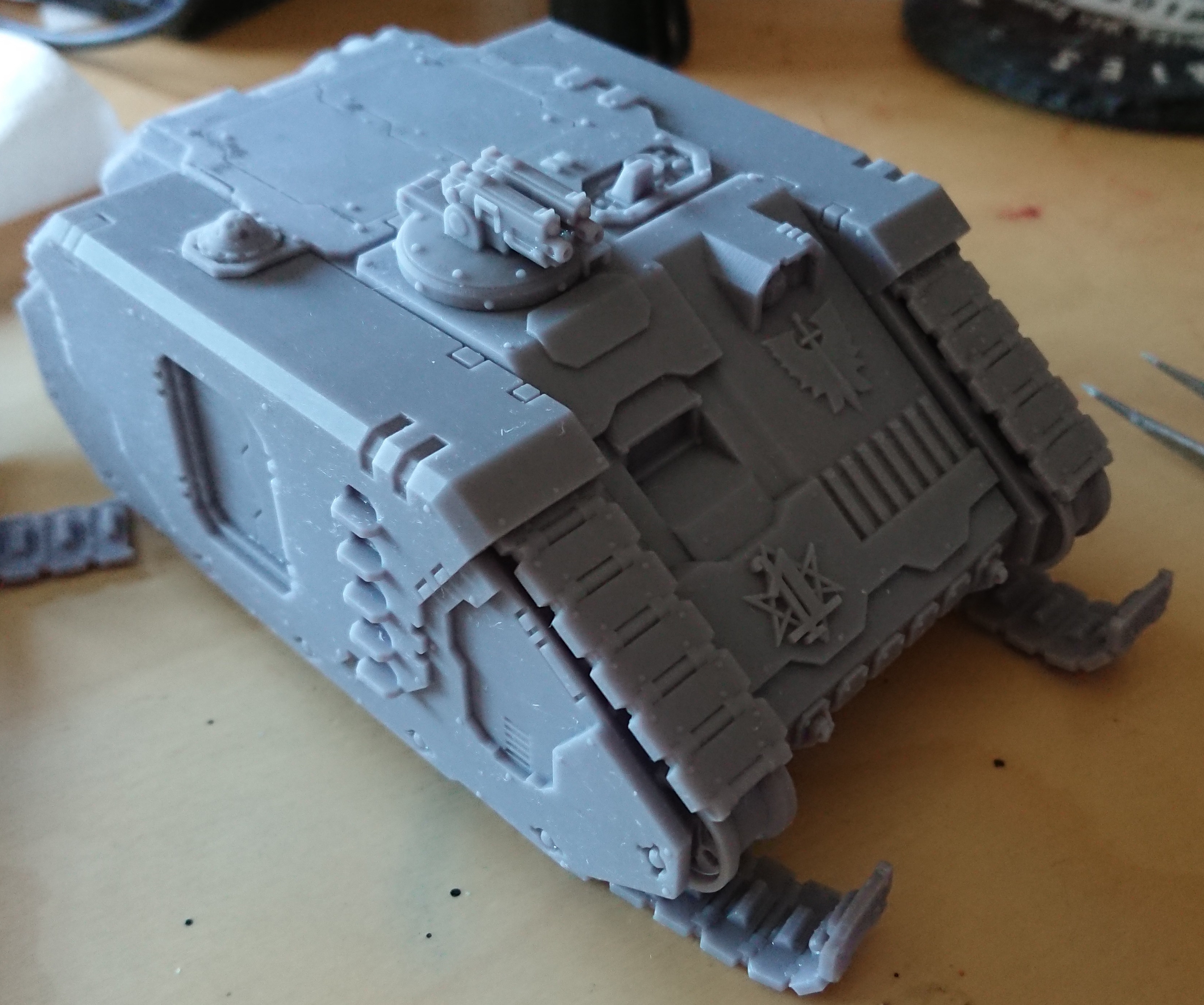 The models have been built for a couple of months, but only at the end of April did they get under coated. The models were assembled, but guns and shoulder pads not glued in place (just blu-tacked). I also printed out an Aion Advancer by Solwyte Studio to use as a proxy Rhino transport. I couldn’t help myself though, and I digitally added some Dark Angel symbols to the hull and I hunted around online for a top hatch and combi bolter STL to better represent a Rhino’s armament.