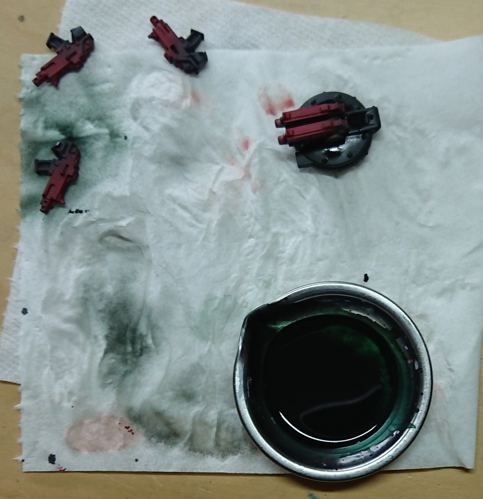 The green-black tint in this case was 3 parts Contrast Black Templar (link) and 1 part Contrast Dark Angels Green (link) paint. Well it looked green in the mixing palette.
