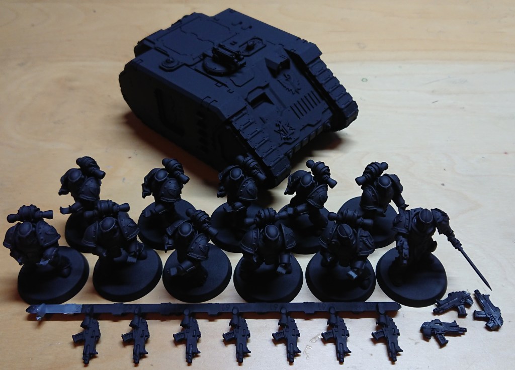 So what was the first models I decided to work on? The gorgeous Inner Circle Knights Cenobium terminators? or the tasty Interemptors? Nope, I’ve started with the basic troops, a simple 10 man tactical squad in Mk III armour. If I ever end up playing HH then I’m going to need some basic troop choices. It also means I can afford to screw up the paint job/scheme on the less expensive models.