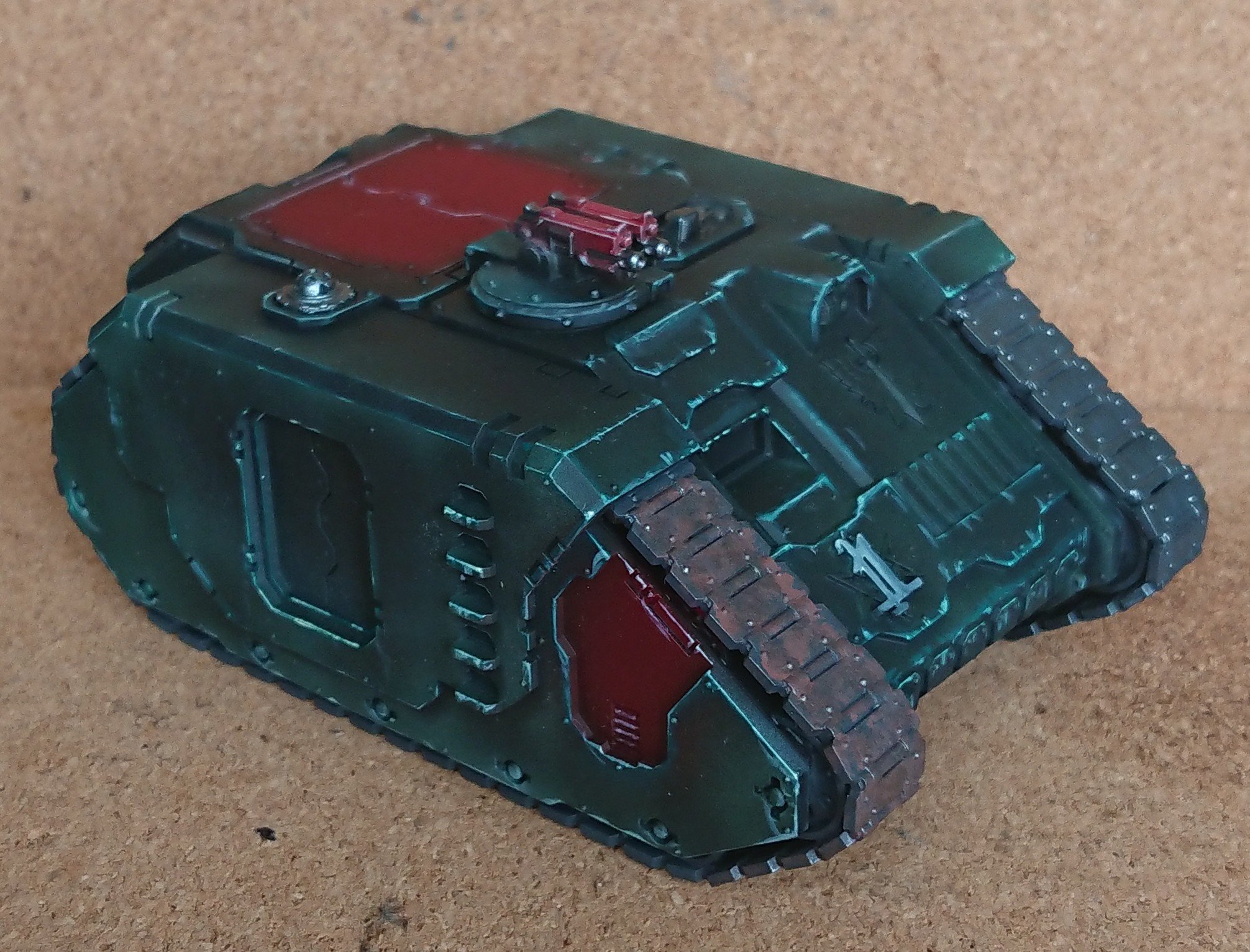 After the decals a black oil wash was applied all over. Although the tracks and red panels also had a brown oil wash too. I tried to make sure that the pristine white of the decals was stained buy the oil wash to make the white look dirty and worn. I’ll the save that image to the next post hopefully with a complete tactical squad to be transported.