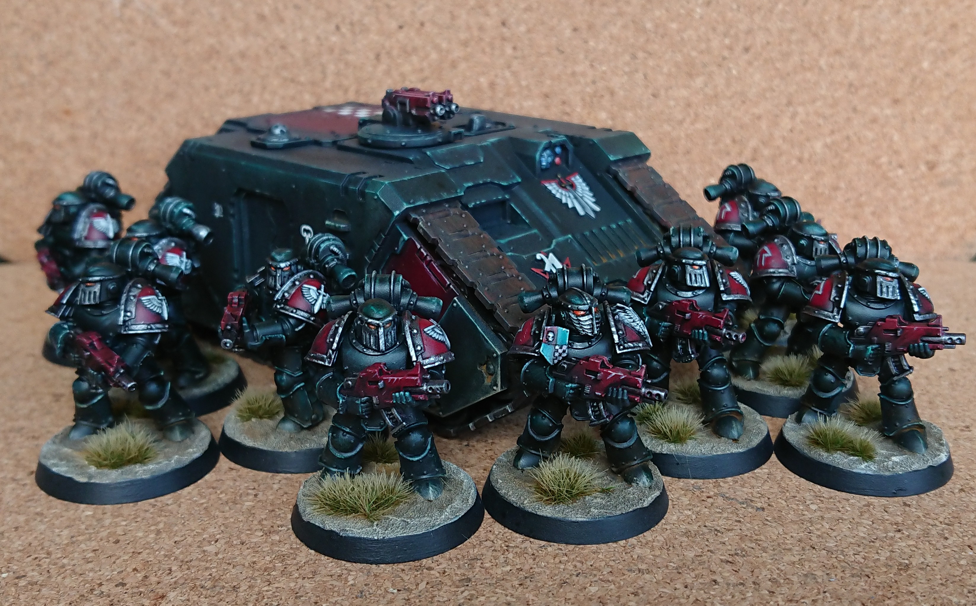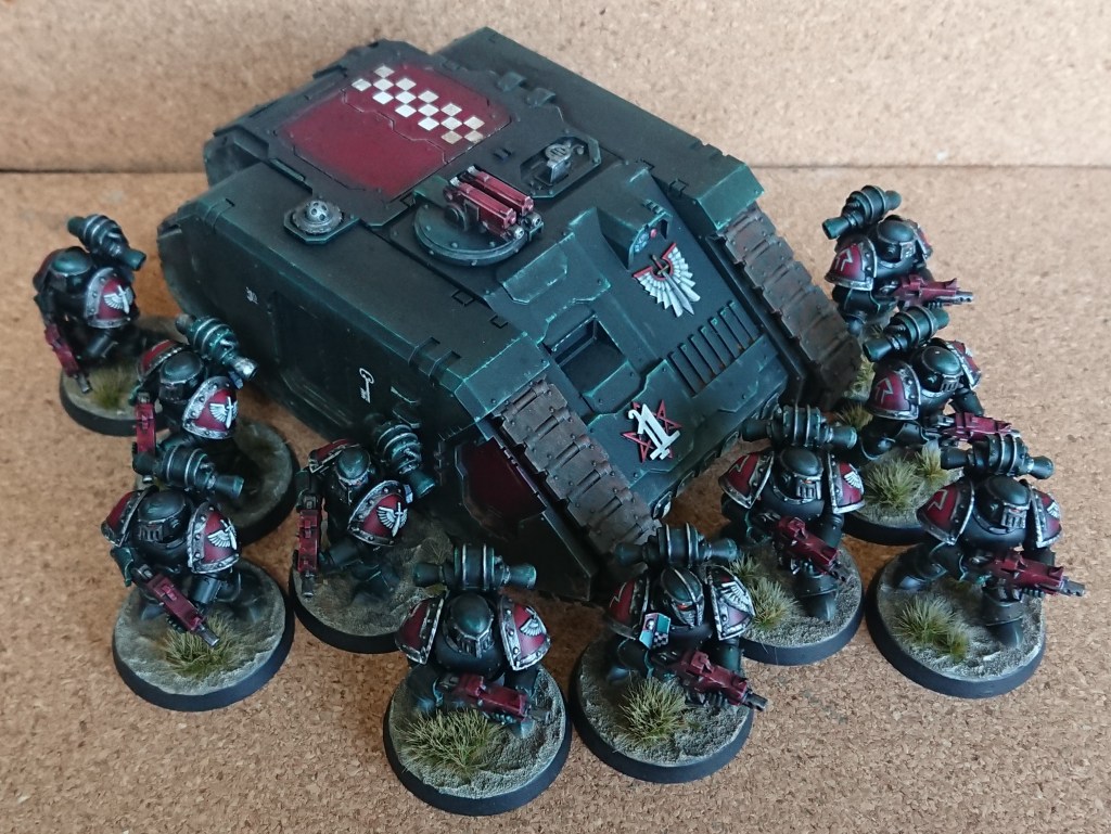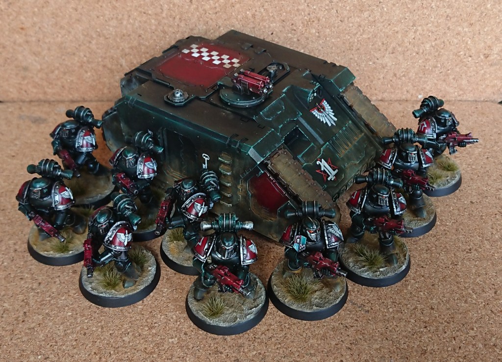 I had just finished taking those photos of the finished models, when there was a knock at the door. That knock was the postman delivering my Horus Heresy Age of Darkness boxed set. So I managed to achieve what I set out to do at the start of June, paint a tactical squad and transport before the new set arrived!! One cool thing that came out first was the neat Element Games HH themed sticker. That was a nice touch!