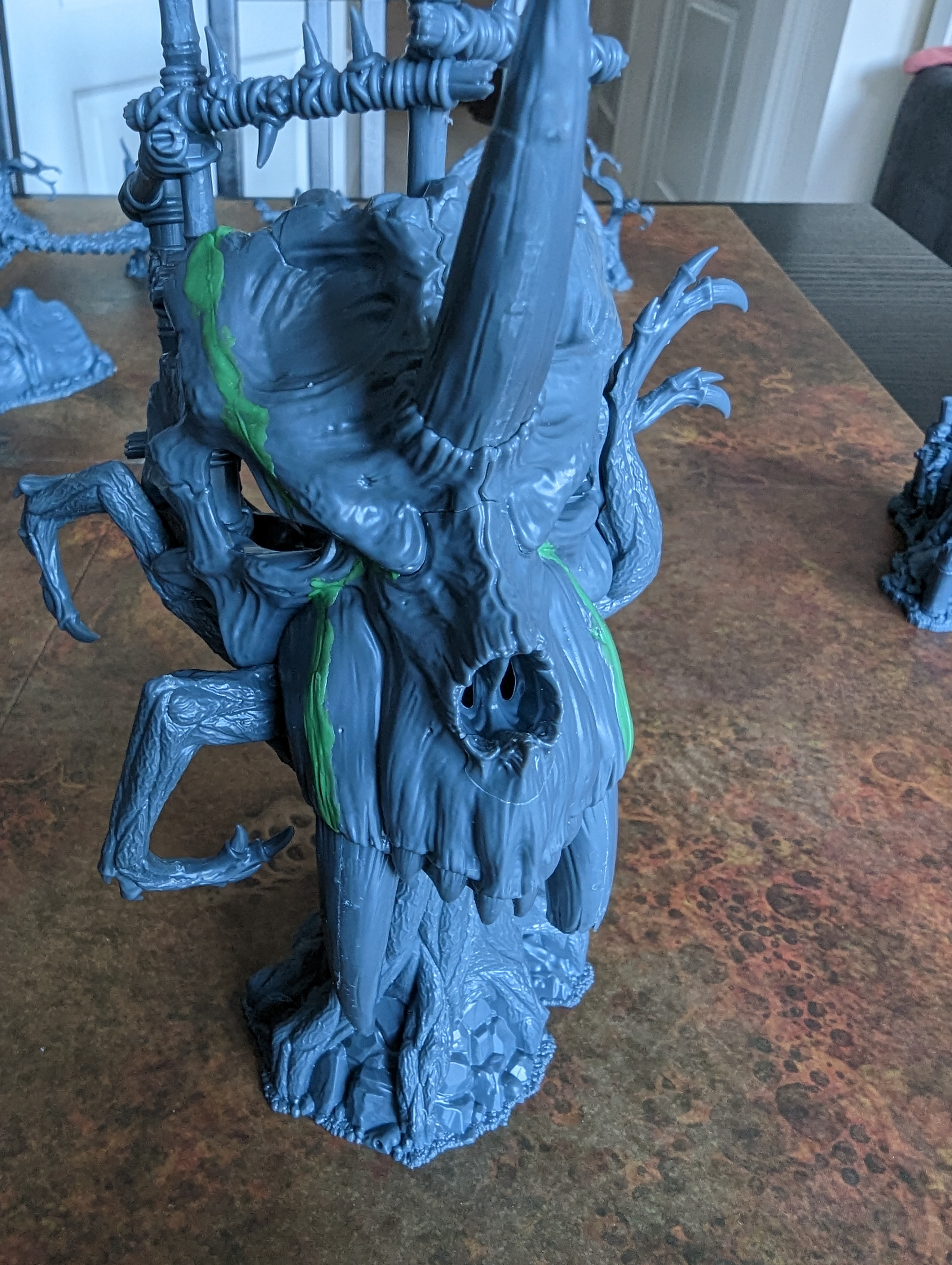 The build of the Heart of Ghur terrain was alright. No real issues for me, I do admit it wasn’t totally intuitive. That is to say, generally, you can build something simple without worrying too much about the instructions. The trees did need me to look at the instructions carefully enough to understand which way round the various parts were meant to be and how they fitted together. There again that is what instructions are for, they are supposed to be read. If you’ve read any of the posts on this blog about building models then you’ll have seen me say that dry fitting parts together is a really helpful thing to do before going near the model with glue. At each step of this build I dry fitted the parts together to make sure I understood how they were supposed to fit before getting glue on the parts. At a guess I think I spent approximately 6 or 7 hours building the terrain, I didn’t really log it. Thursday night, Friday night (a good long stint as it wasn’t a work night), and finished off the accessories Saturday morning. Then I spent a short amount of time Saturday night gap filling.