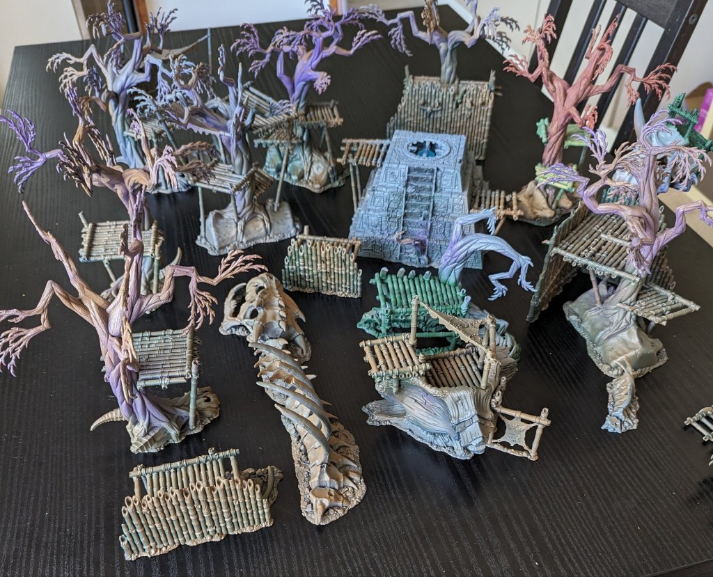 Picture below shows the whole set of terrain. You can spot most of the original Heart of Ghur terrain from the slightly different colours. The very red tree to the right of the ziggurat, which was the furthest progressed piece having had rattlecan, airbrush, and oil washes used on it. You can see the watch tower just below it with the grey skull and green bamboo platform. The other easy to spot piece is the platform/tree/skull just below the ziggurat.