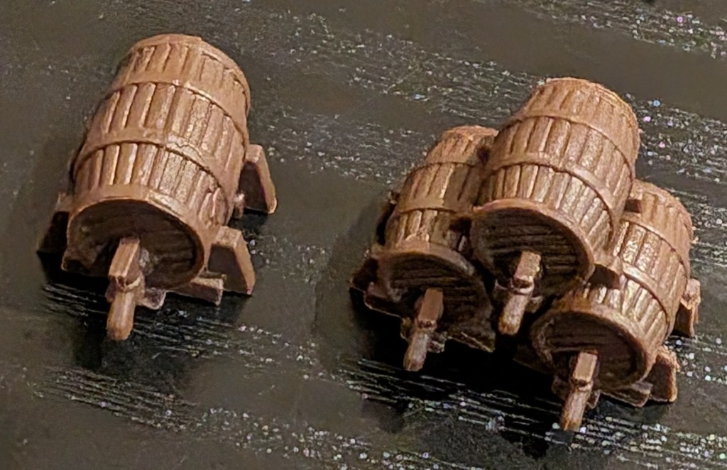Finally behind door #7 we have another two pieces of terrain. A stack of 3 tapped beer kegs, and a single tapped beer keg.
