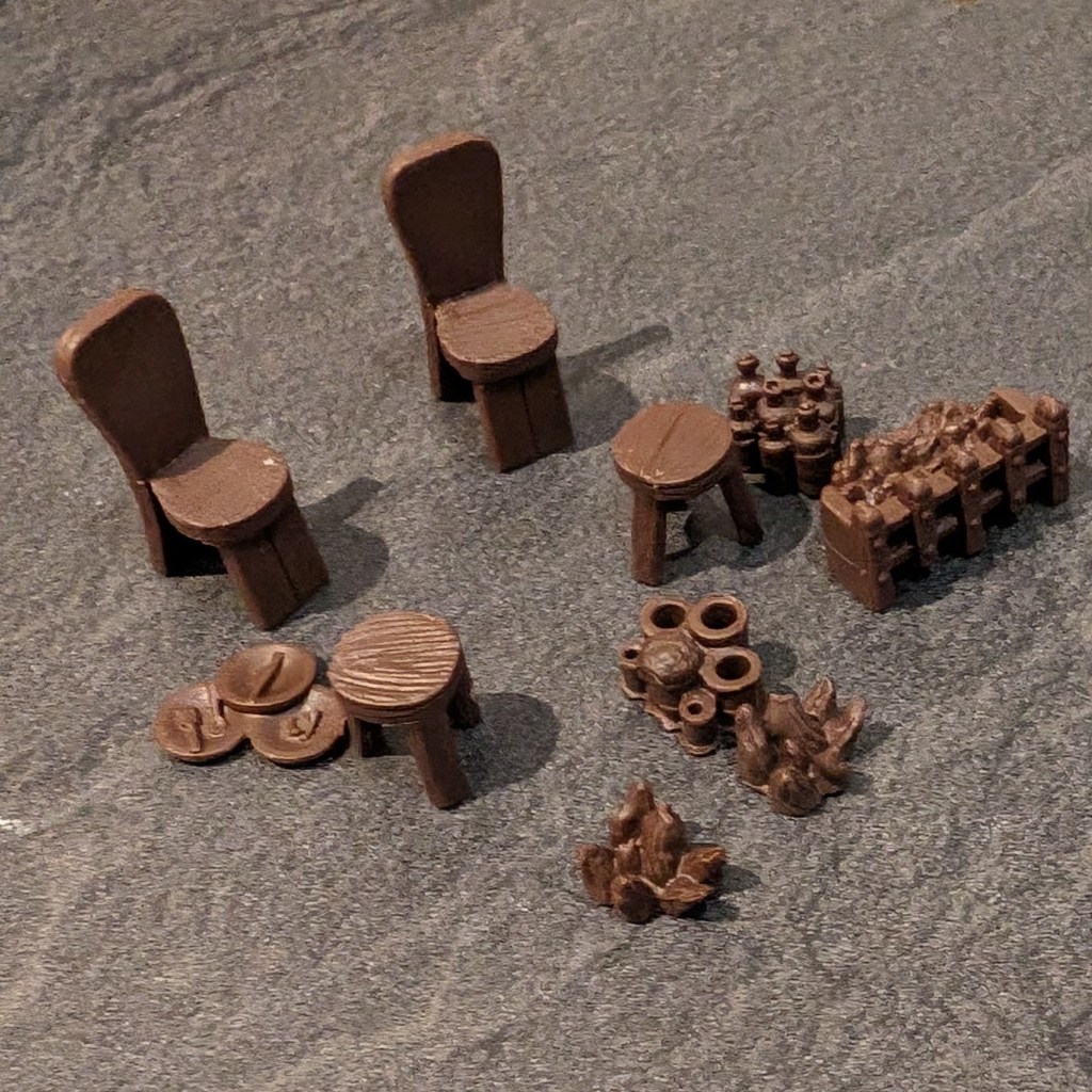 Behind door #9 we have another zip bag of terrain accessories. A stack of plates, a collection of tankards, and some bottles. Then 2 chairs and 2 stools. Finally a fire grate, and possibly 2 open fires – although I’m really not sure what the last two items are.