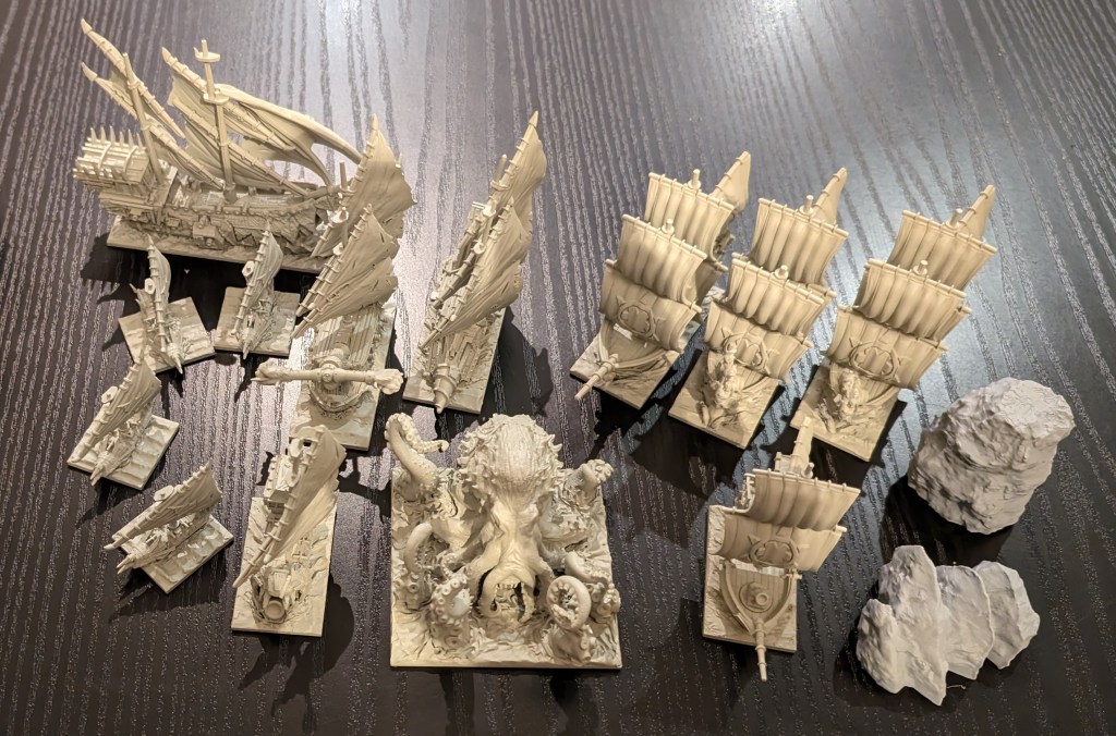 I did a batch spray undercoating of a few things. The built Orc Fleet, the built Basilean fleet, a Kraken (for scenario 2), and some terrain (rocks). The terrain was sprayed light grey, and the rest were given a spray with TT Combat Strigoi Flesh. The light undercoat specifically chosen for the Xpress paints to work their magic on.