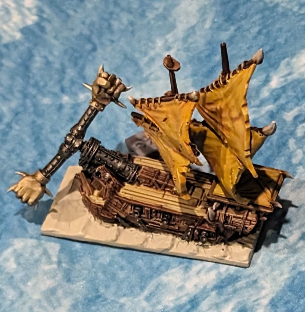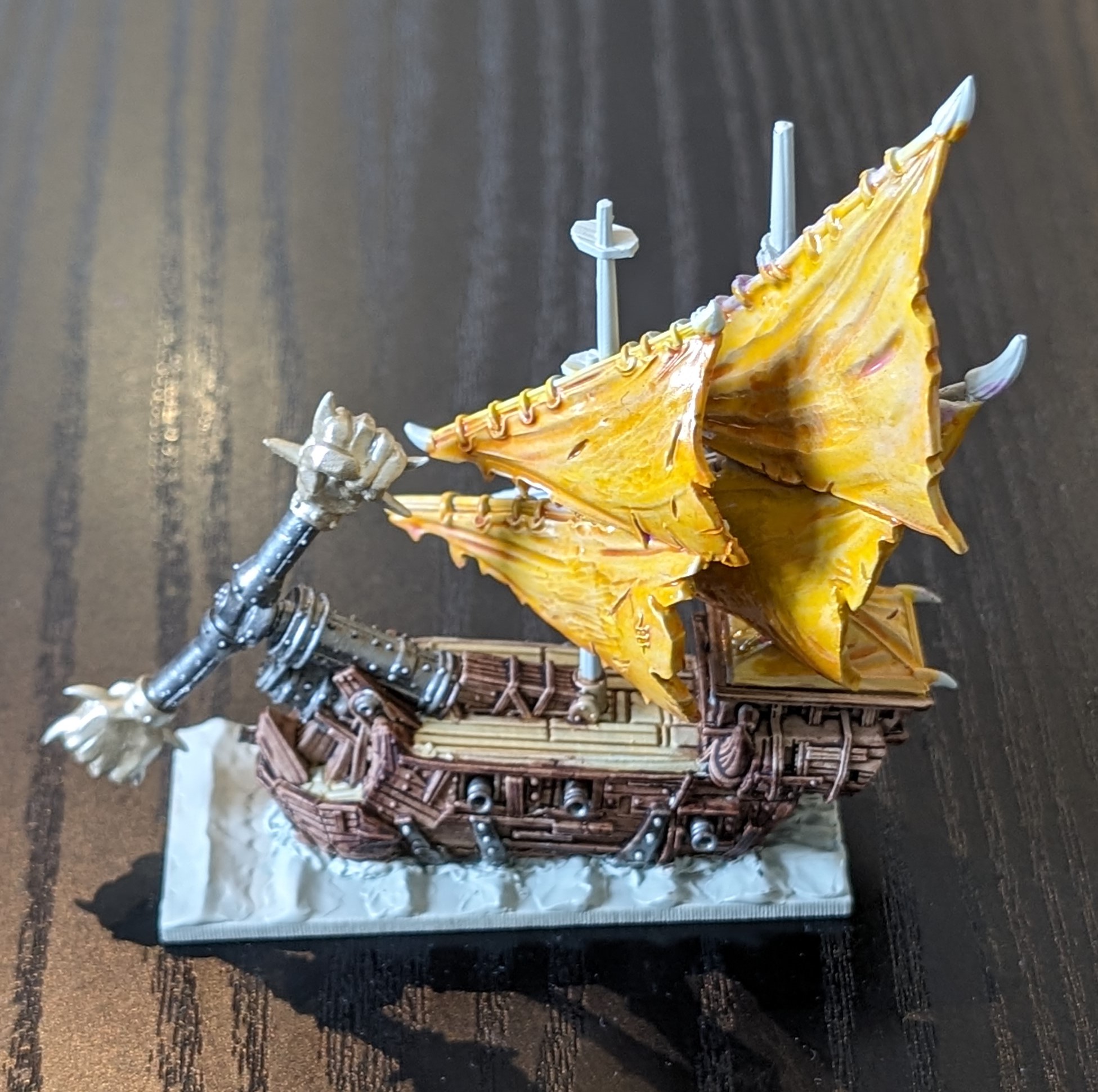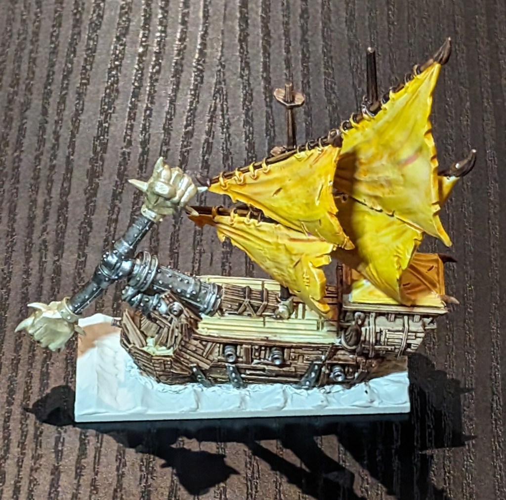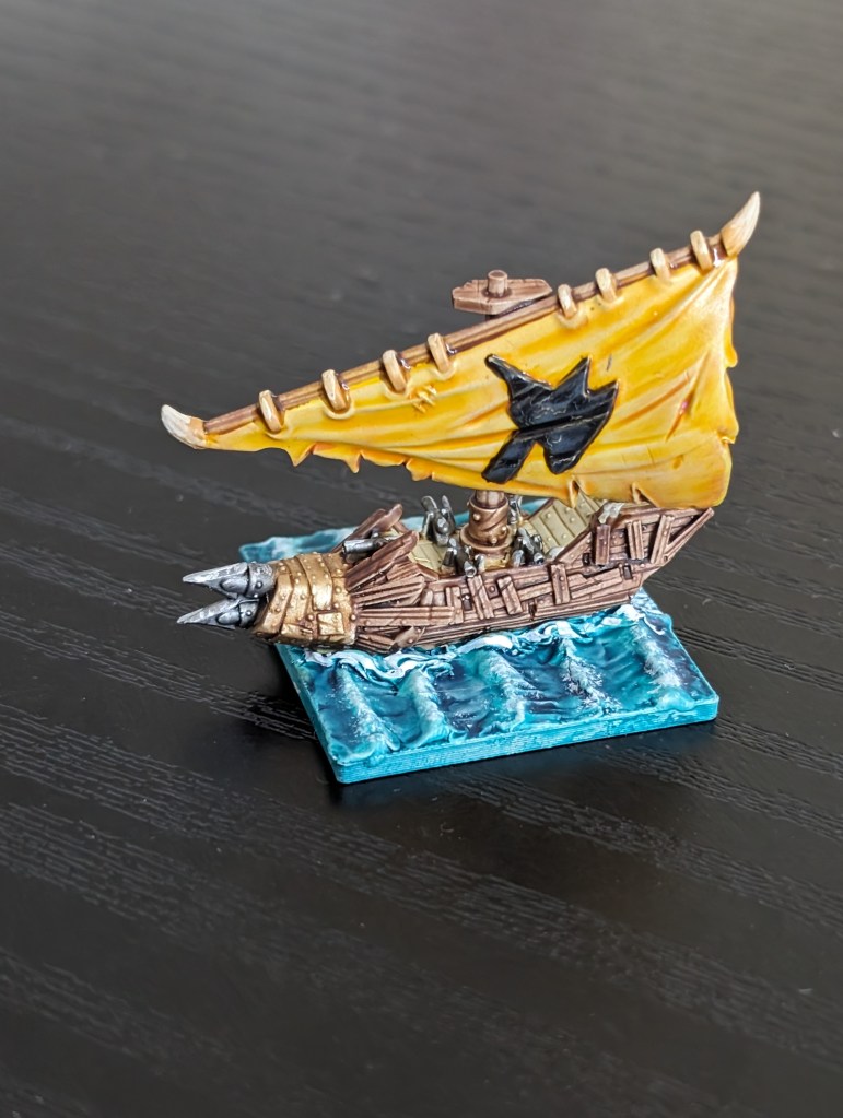 Making things ship shape 😉 OK so I think the Orc ships have some large animal horns used in their construction at various places. They definitely look like horns, most obviously at the end of the yard arms, but also in other places. I don’t have the specific paint colours I used to hand. I just picked up a light brown (possibly P3 Rucksack Tan) to base coat the horn. While painting the horns I also painted the ropes (robands) in that colour too. I then added lines in an off white (possibly Scale75 Mojave White) running along the length of the horn, narrow at the base and wide at the end of the horn. Then a white (Two Thin Coats White Star) was used within the previous lines. Finally a wash with age old favourite Agrax Eartheshade (don’t think its the new glossy one). I also went along the sail/yard arm boundary with Agrax to help define the boundaries between sail and rigging. Then I also used Agrax on the bronze metals to shade those too. The silver metals got a wash of the other age old favourite; Nuln Oil (again not the newest rendition). I went back and highlighted just some of the raised edges of the metal work with a bright silver.