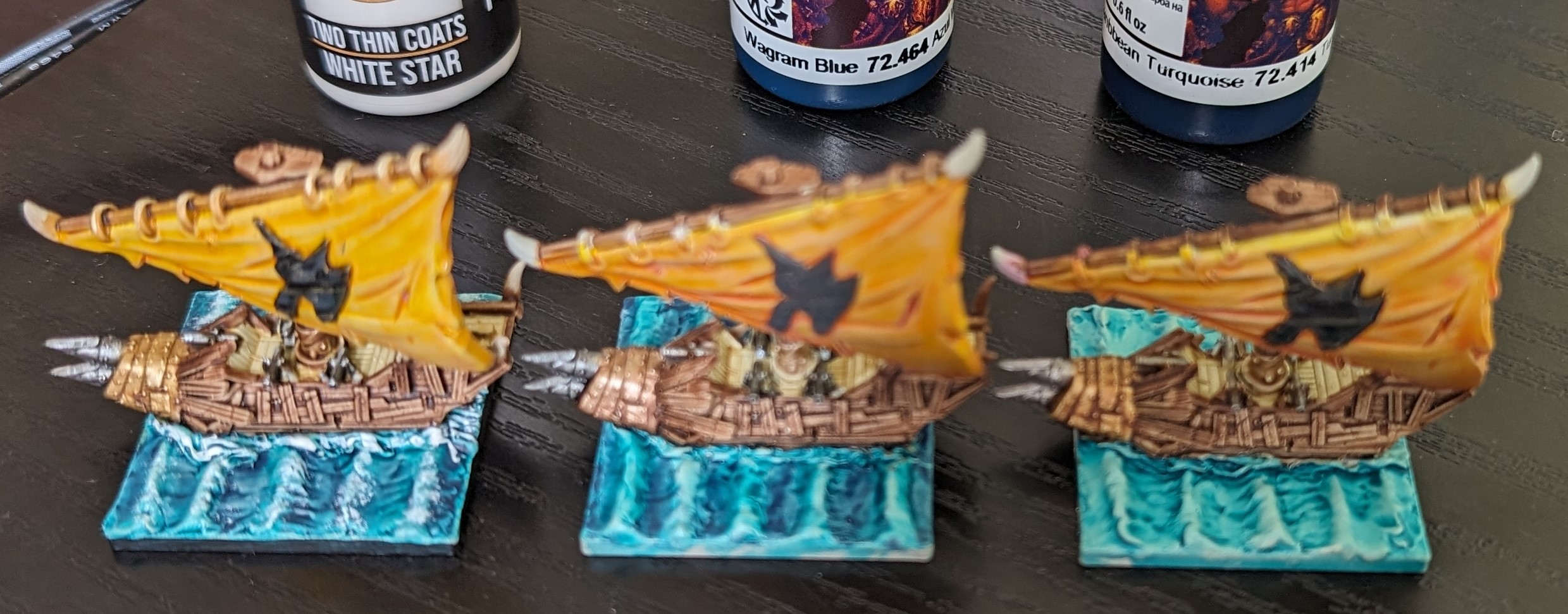 The idea was to paint the fleet quickly with minimal effort, so let’s break out those contrast paints. I painted the deck of the ships with Bag ‘O’ Bones thinned with medium, and I painted the sails Fluid Pink thinned with medium, aiming to have the pink in areas where I want the yellow sails to be shaded (yes I’m