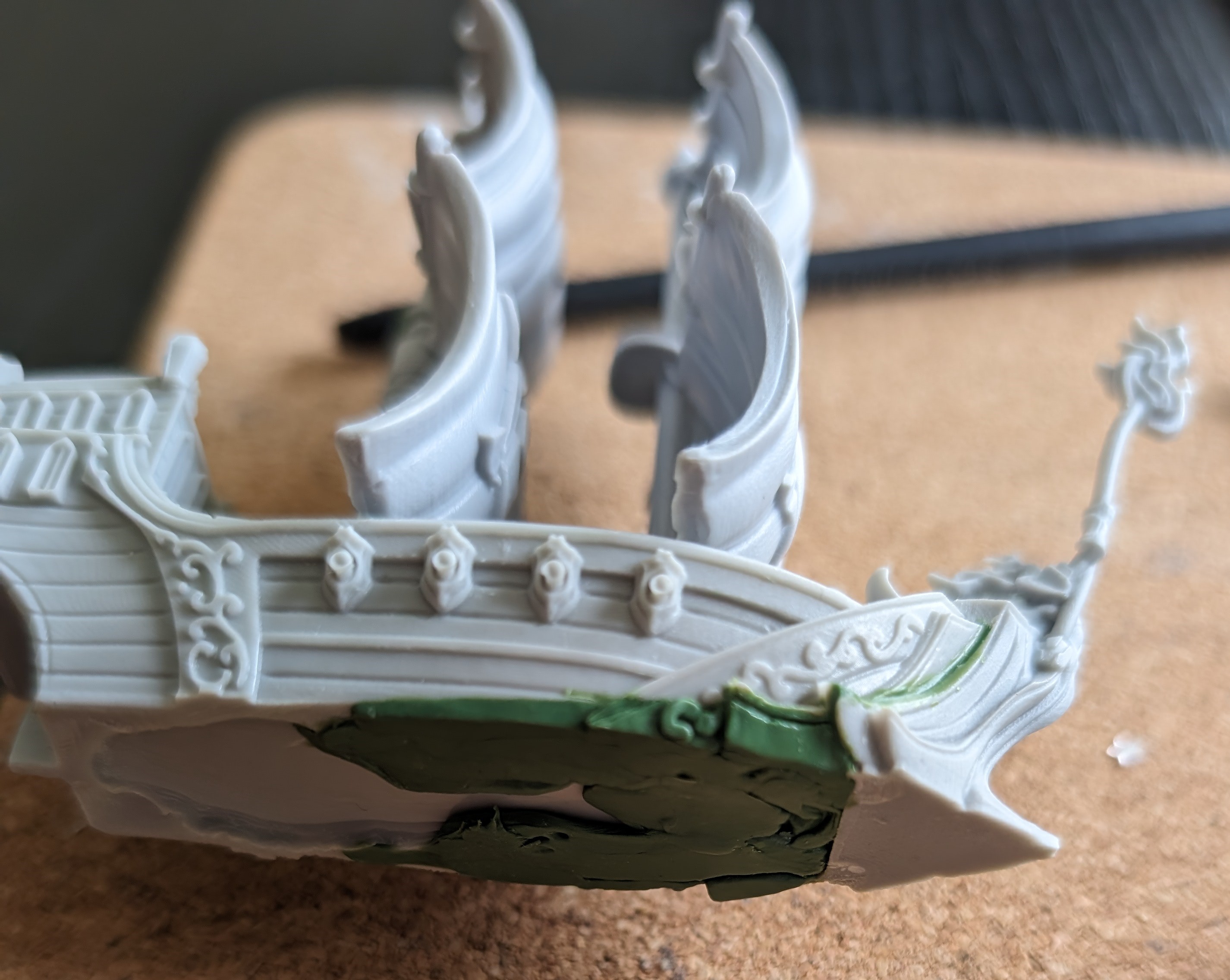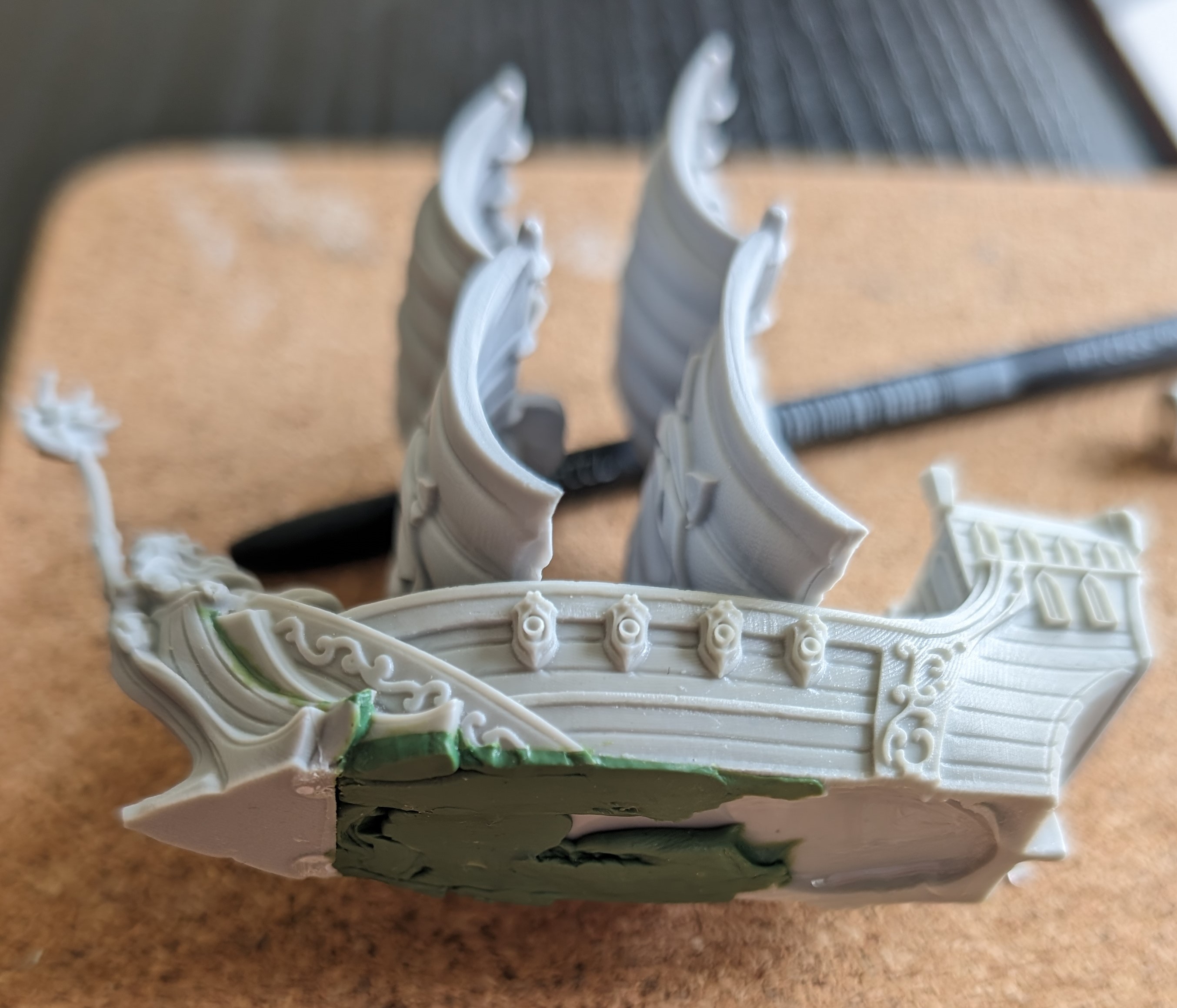 *Why did my initial interest die off? I imagine covid and the lack of regular gaming killed some motivation. But so did the amount of work I found putting in to getting the models together. The resin cast model hulls appeared to from a one part mould with the base of the hull being the open section of mould where the resin was poured in. It looked like Mantic cleaned up the base of the hulls with a belt sander. Some poor soul had the job of sanding the bottom of each hull flat. Unfortunately, they probably got bored, and quality suffered. I had some hulls that were very uneven and had removed too much hull. I attempted to re-sculpt the missing detail, and this proved a little arduous, especially combined with sculpting waves and wake on bases which may or may not have hidden my efforts anyway.