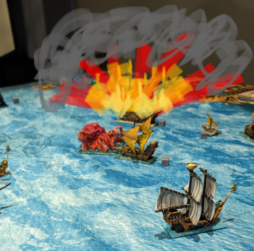 I had a right laugh trying to wound the Kraken while holding off two other fleets. We had a three player game just to get a few of us trying to learn the rules. I found out that getting set on fire is very dangerous, and the while fighting fires, 1s appear on your dice 7 times out of 6. This led to the explosive demise of half my fleet.