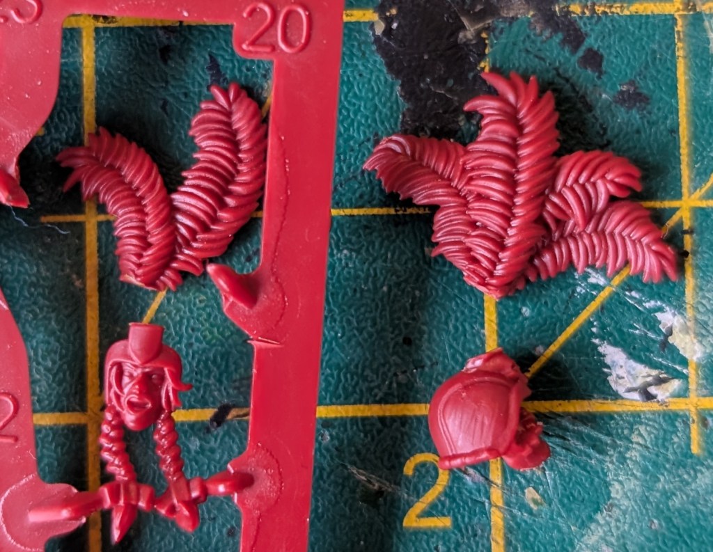 Head 2 & 3 – took the Bodyguard’s heads and chopped off a feather to take them down to two feathers each. I did my best to disguise the removal of the feather on the back of the plume. I am sure no one will notice the cut mark once covered in paint on the rear of the head.