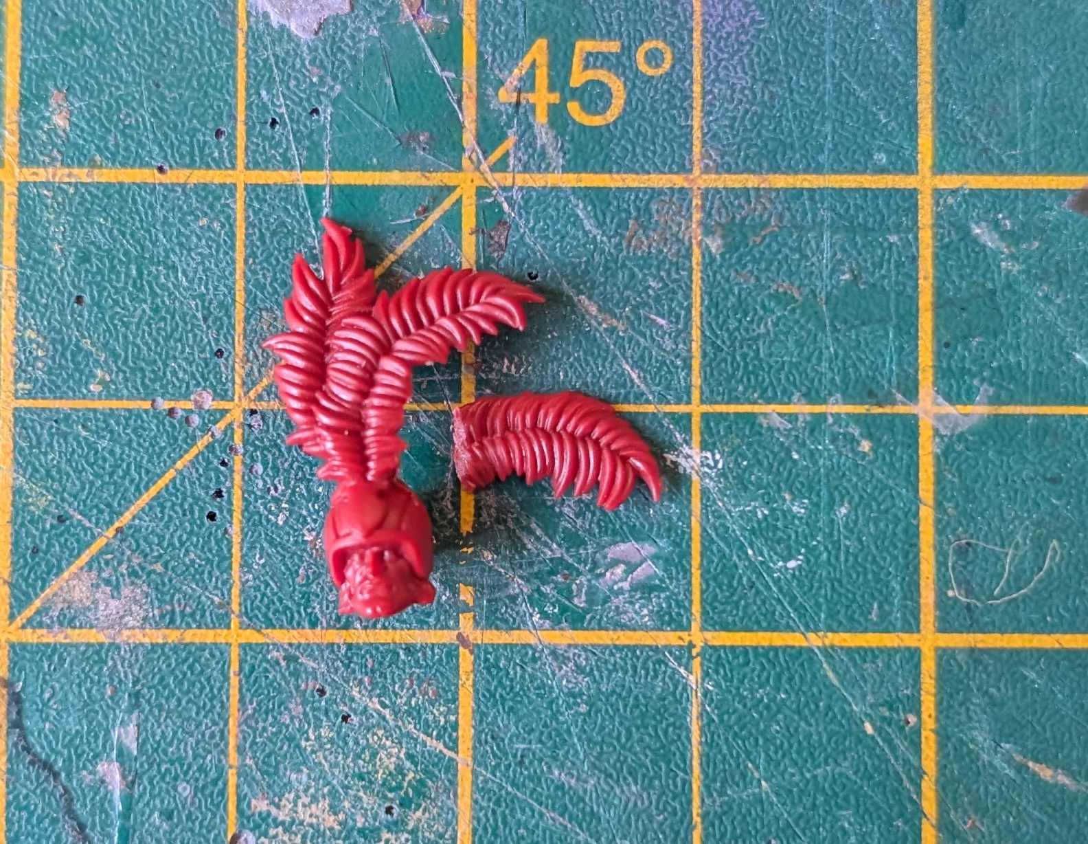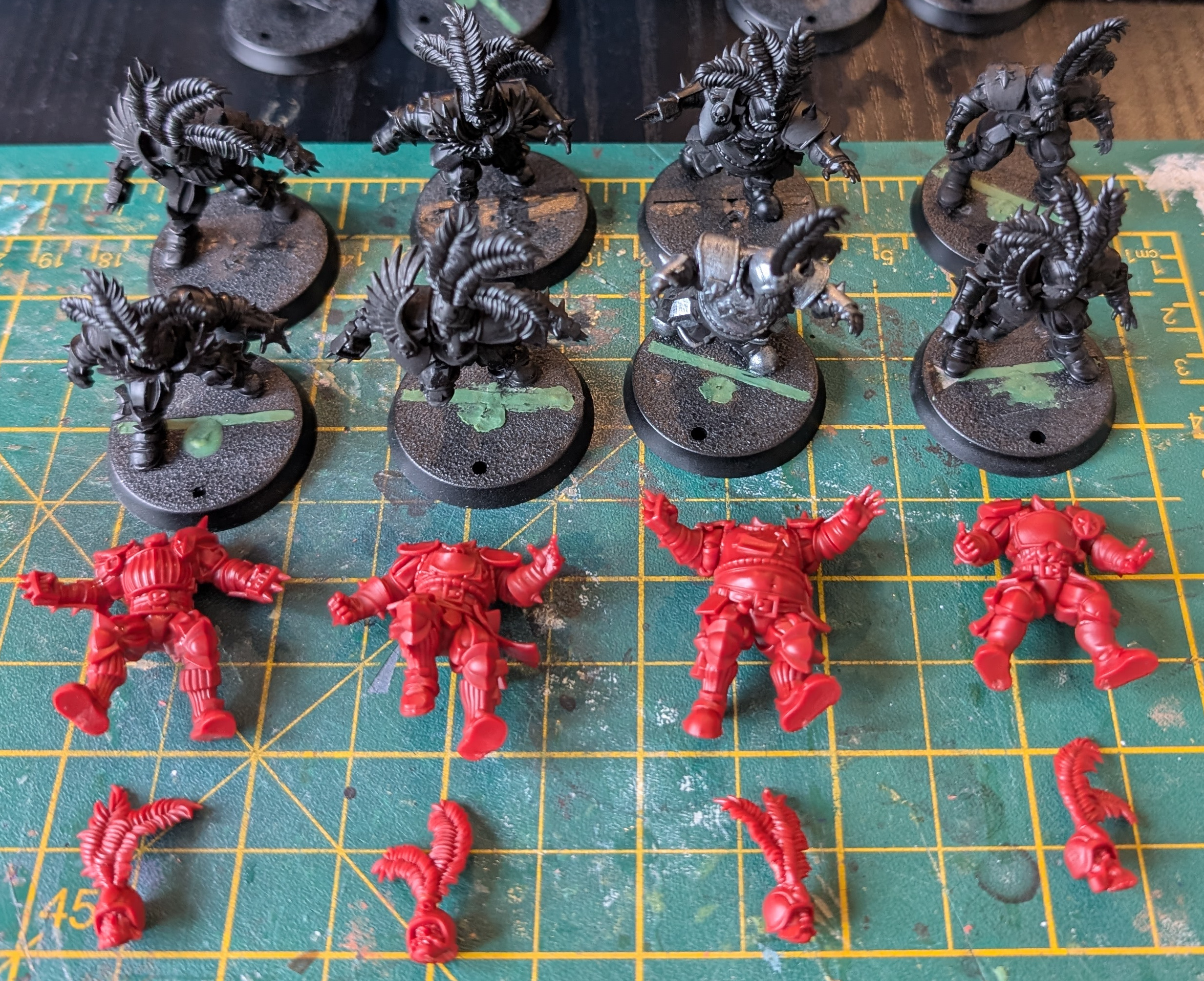 Head 2 & 3 – took the Bodyguard’s heads and chopped off a feather to take them down to two feathers each. I did my best to disguise the removal of the feather on the back of the plume. I am sure no one will notice the cut mark once covered in paint on the rear of the head.