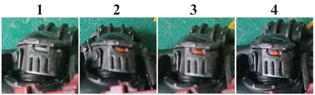 I was up early Saturday morning, sadly it wasn’t excitement of the new box arriving or the drive to finish painting my squad, but a trapped nerve in my shoulder I did a week ago. Still up I was, and so I took the opportunity to paint the Dark Angels (its my left arm that’s causing issues, I’m right handed, and the gentle manipulation of holding a model while painting it has actually helped keep the pain at bay – lucky eh!). First job was to finish off the bases, which I outlined in my last post. Then I moved on to the eye lens.